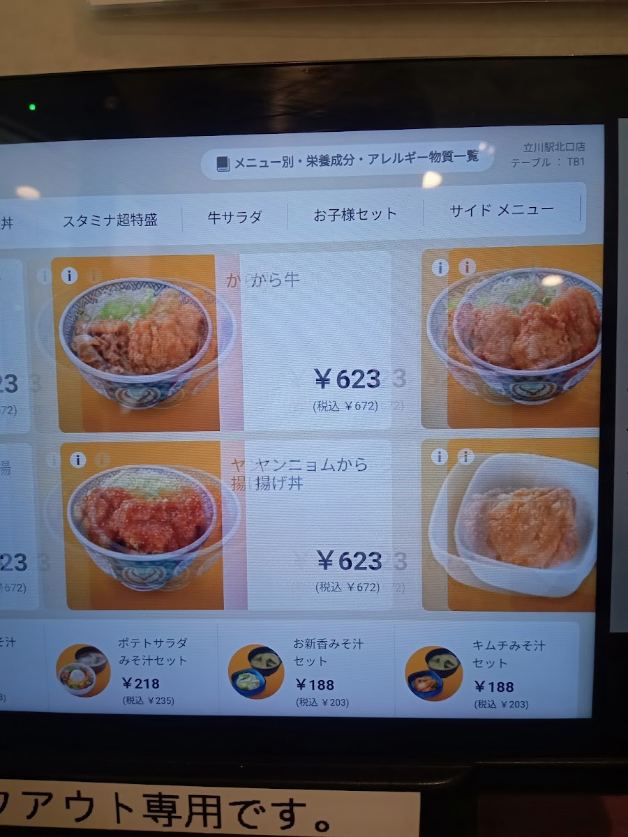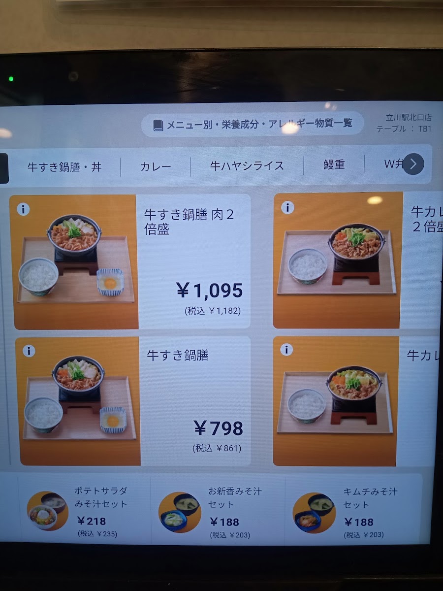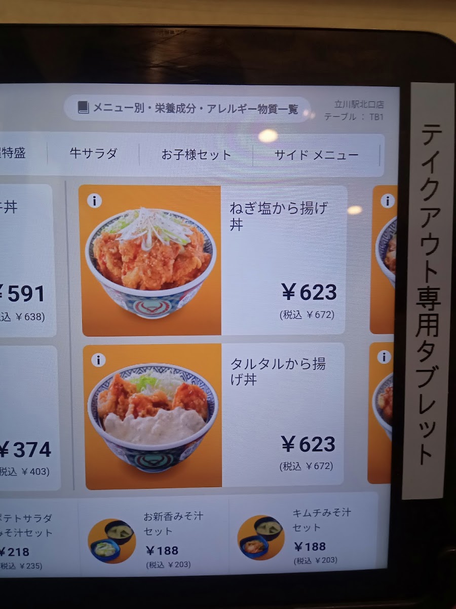 The menu at Yoshinoya Tachikawa Sta. North Exit Shop offers a variety of flavorful Japanese comfort foods that are sure to satisfy any craving. The standout dish is the からあげ黑カレー, which features crispy fried chicken paired with a rich, dark curry sauce. Another popular option is the 牛丼ととん汁, a combination of the classic beef bowl served alongside a savory pork miso soup. For those looking for something heartier, the 牛カレー鍋膳 is a must-try, with tender beef and curry served in a hot pot. The restaurant also offers lighter dishes like the 親子丼, a delicious chicken and egg rice bowl. For those seeking a more indulgent experience, the 厚切り豚角煮定食 is a perfect choice, offering thick-cut braised pork belly served with rice and sides. The から牛 combines fried chicken and beef, offering the best of both worlds, while the 角煮です showcases tender braised pork in a rich, flavorful sauce. With a menu that balances both classic favorites and more innovative offerings, Yoshinoya Tachikawa is a great destination for those craving delicious, satisfying Japanese meals.